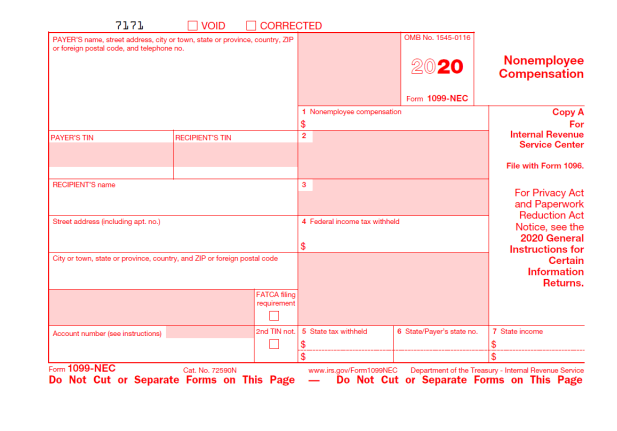 If you believe you will need to file Form 1099-NEC (or any other Form 1099 and Form 1096), you can order the forms *FOR FREE* from the IRS. Click here to place your order. Do it now because, in a plot twist that no one saw coming, it turns out that the IRS is a little behind on order fulfillment. Hard to believe, I know. The forms they will (eventually) send you are the tractor paper/carbon copy kind that would have probably been useful in like 1987. But they will work if you only have a few forms to fill out and don’t mind writing them by hand. If you need the kind that will go through your laser printer, you will have to purchase those elsewhere (online, Office Depot, etc).